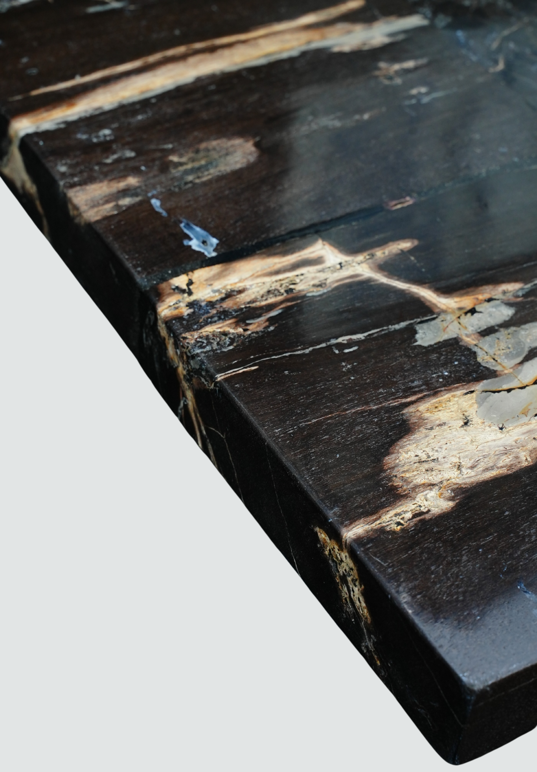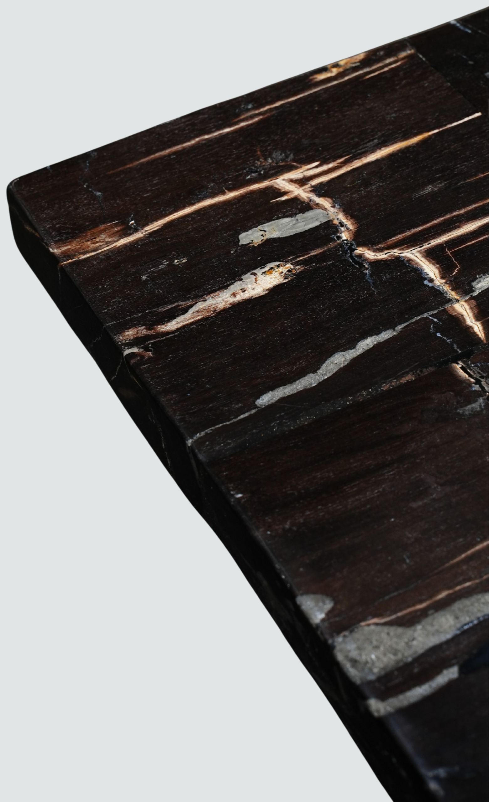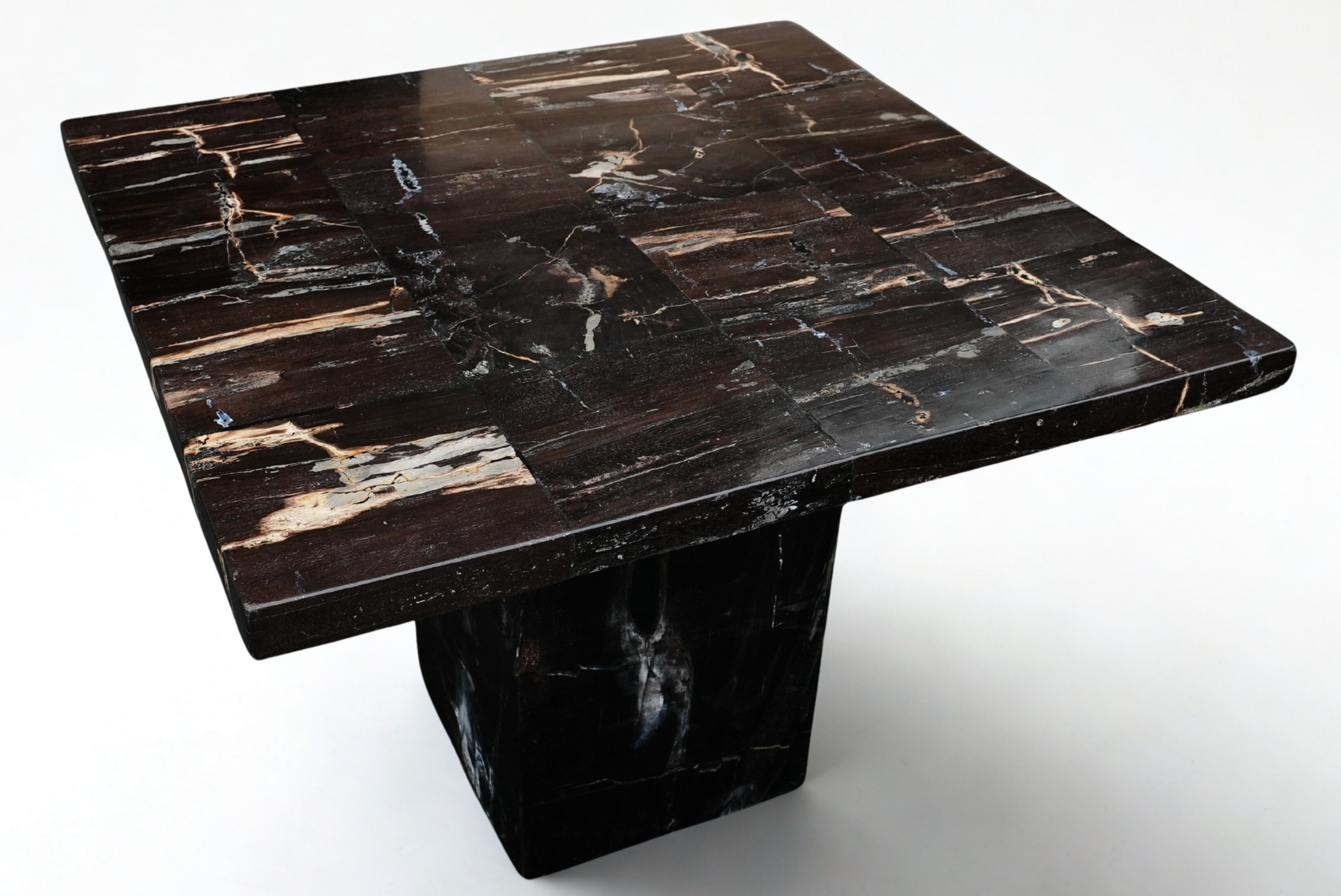Plateau carré en bois pétrifié aux motifs minéraux naturels uniques, porté par un piètement central.