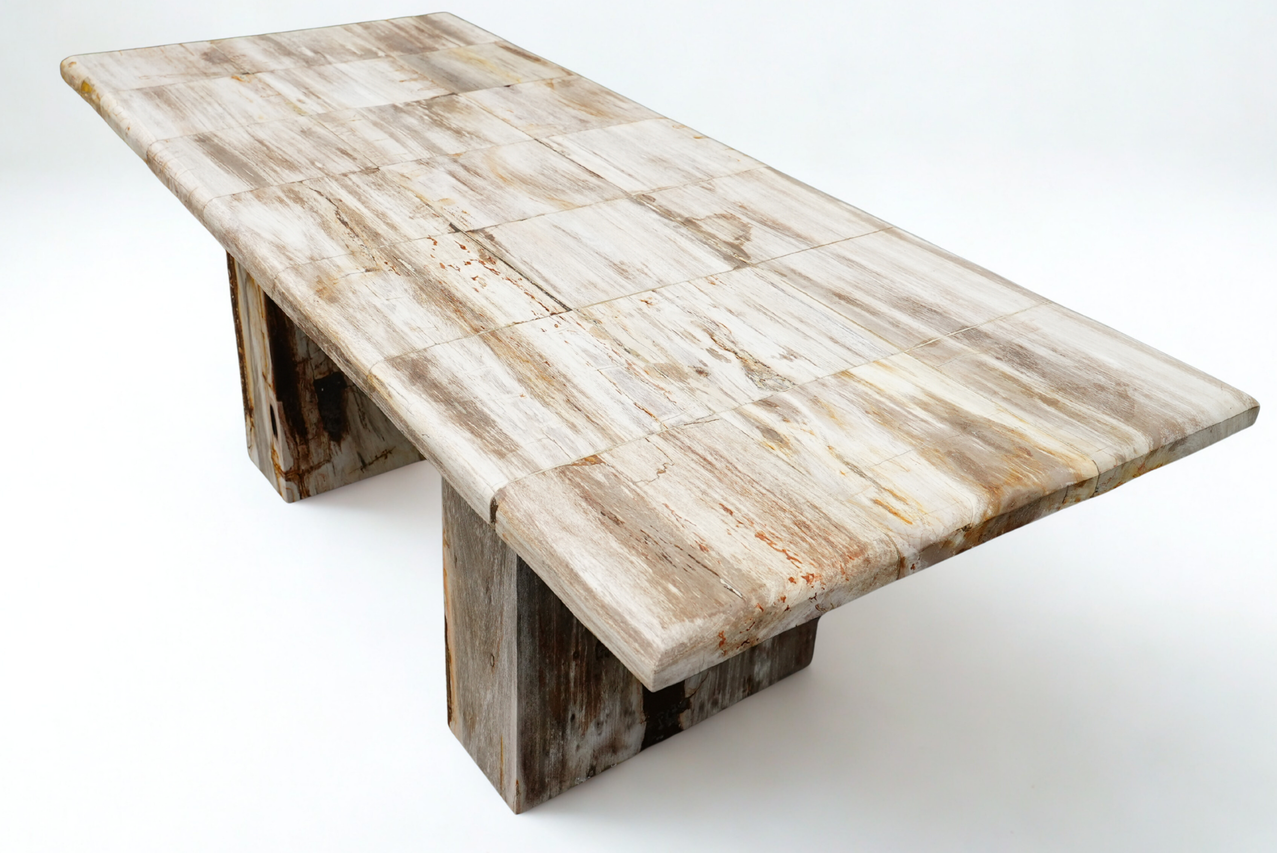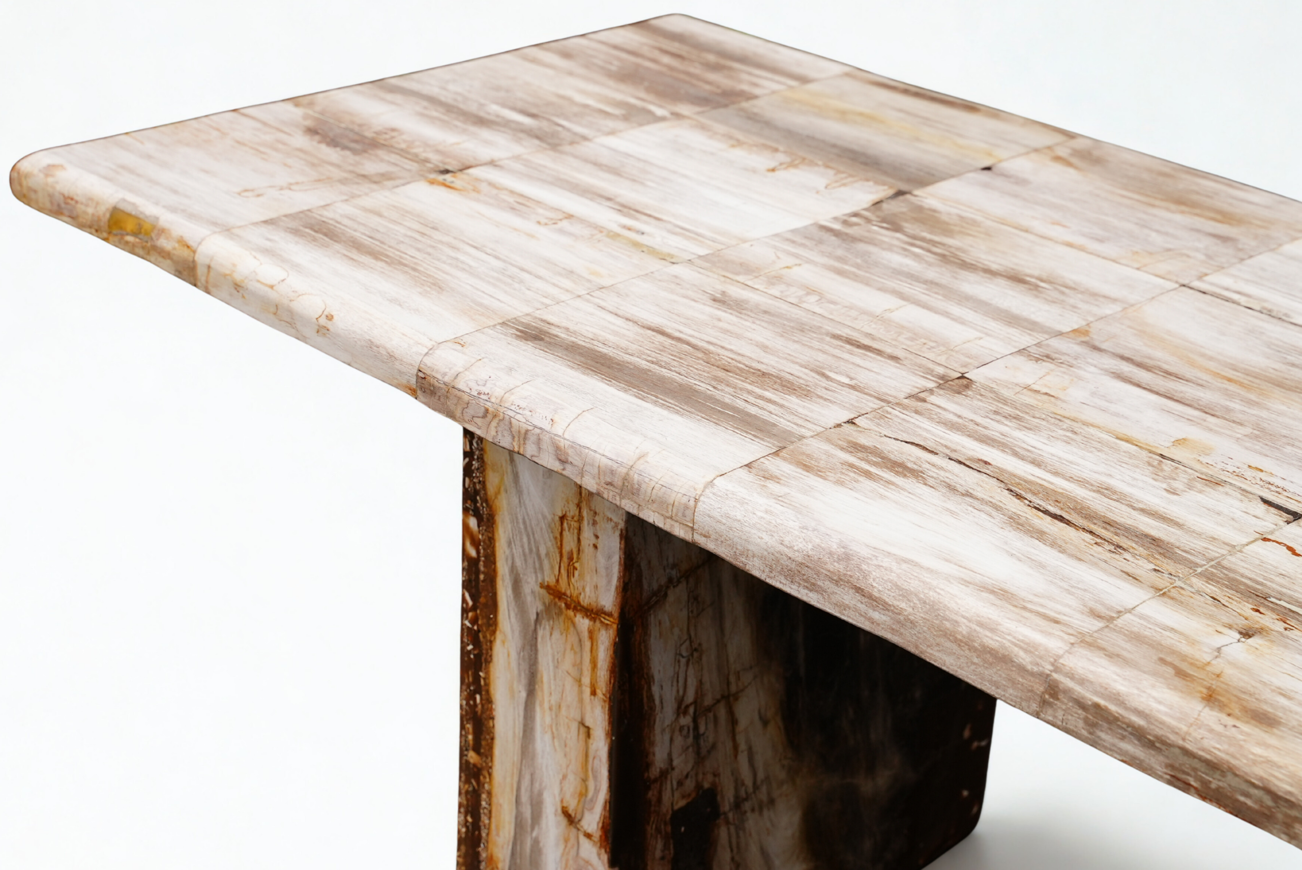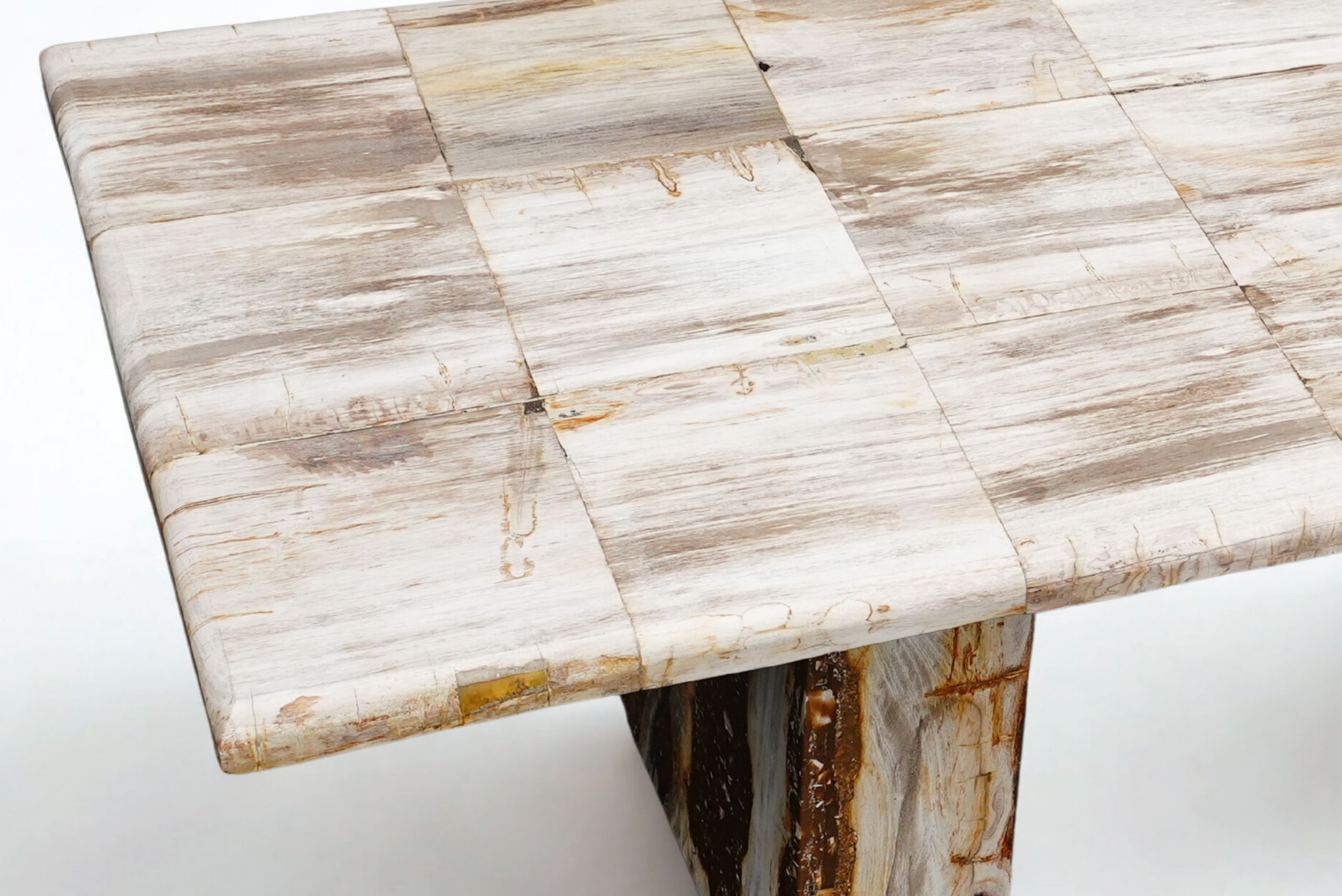 Table rectangulaire en bois pétrifié clair à plateau mosaïque aux tonalités minérales naturelles et lumineuses.