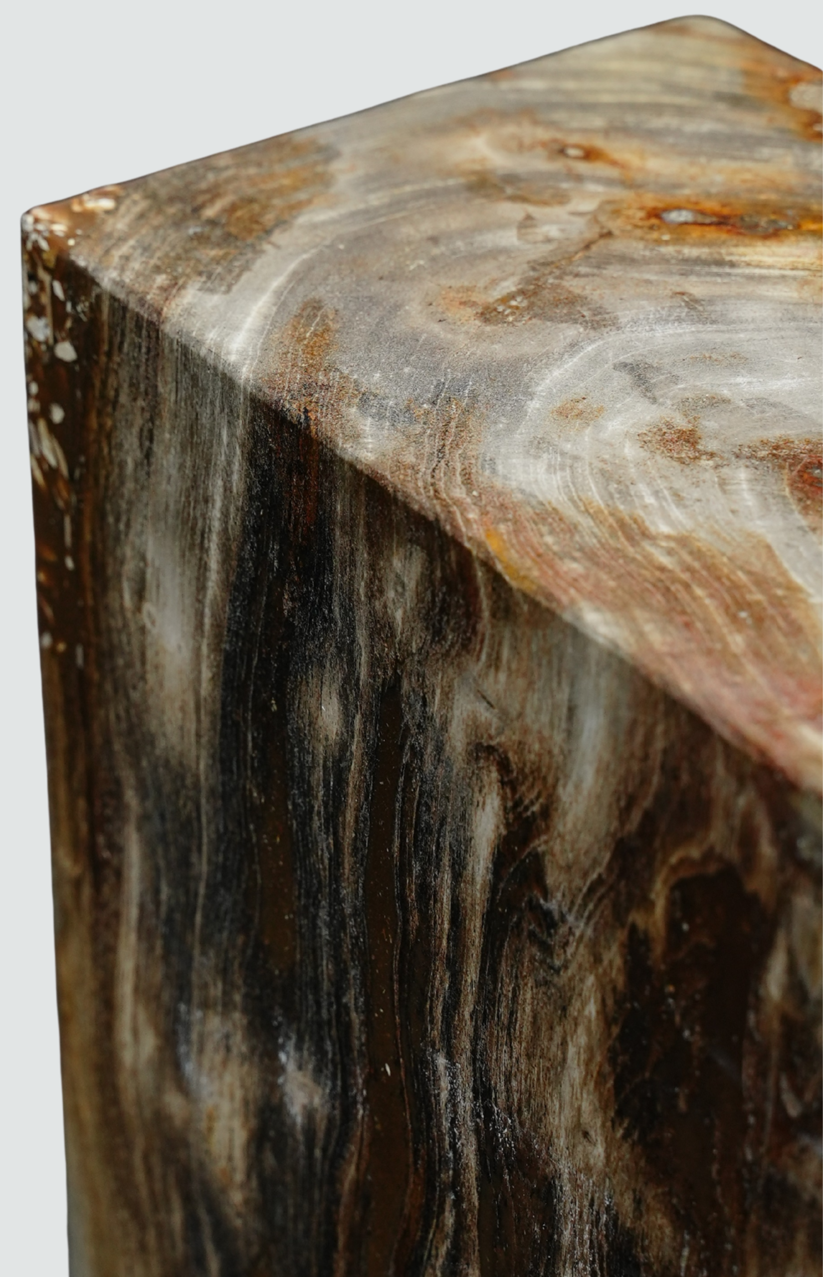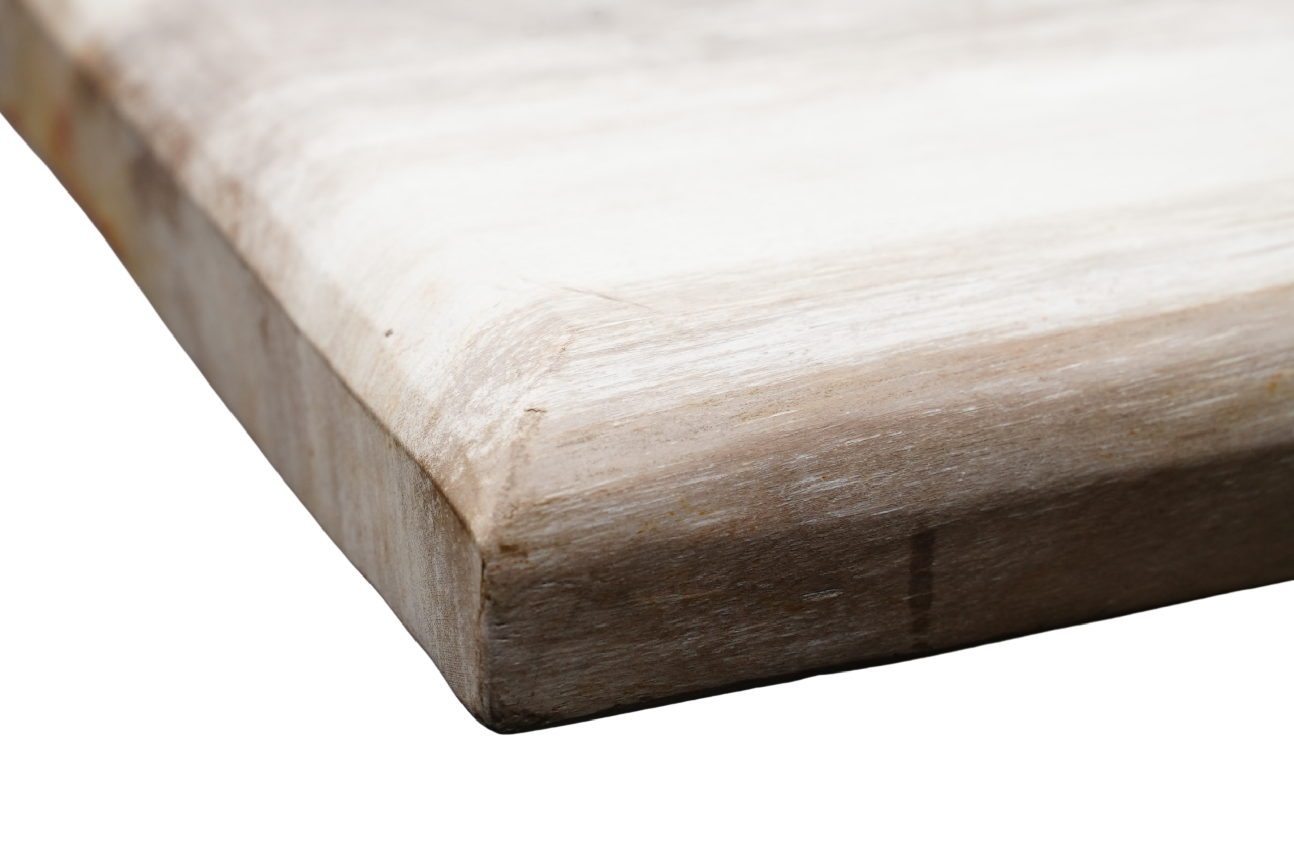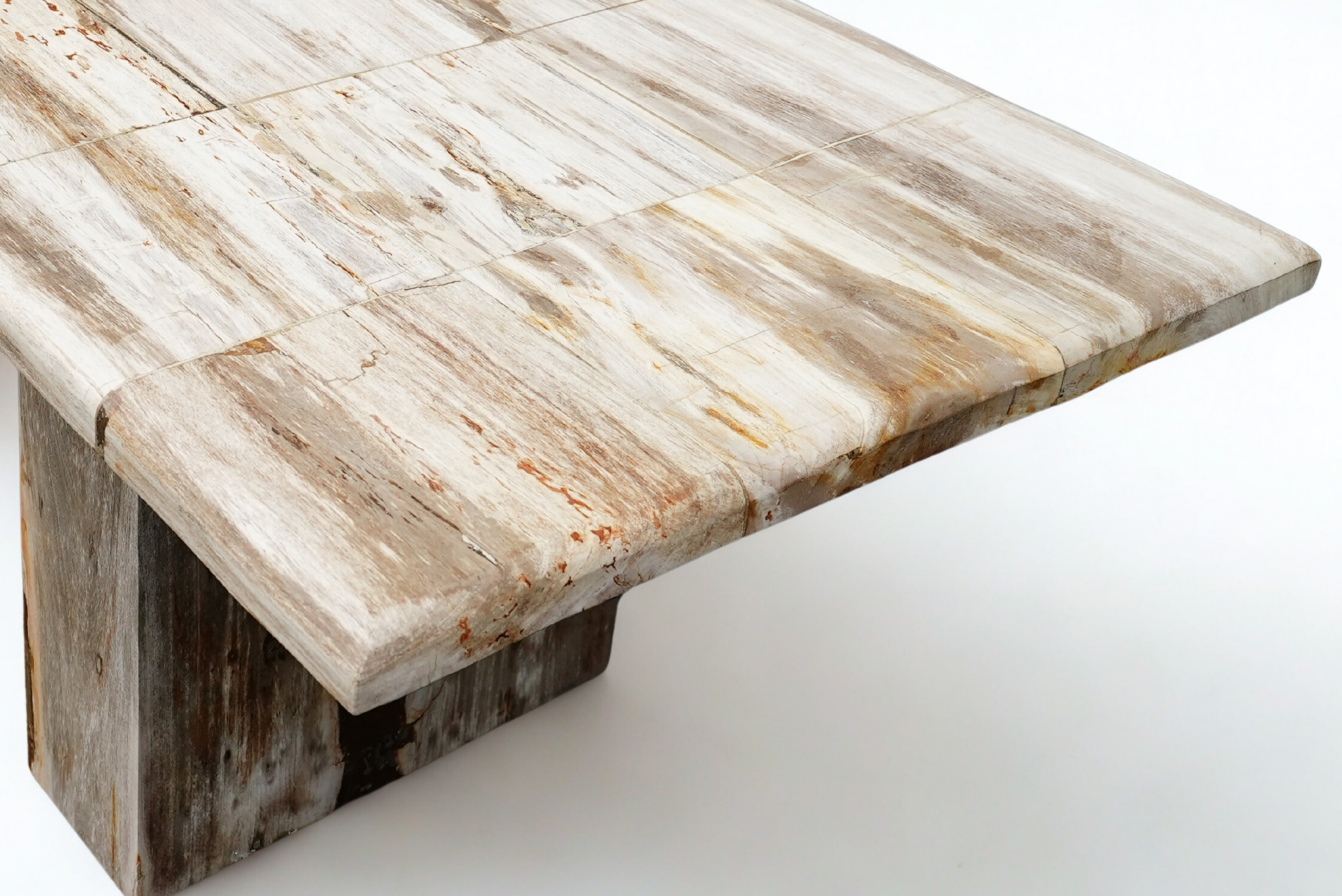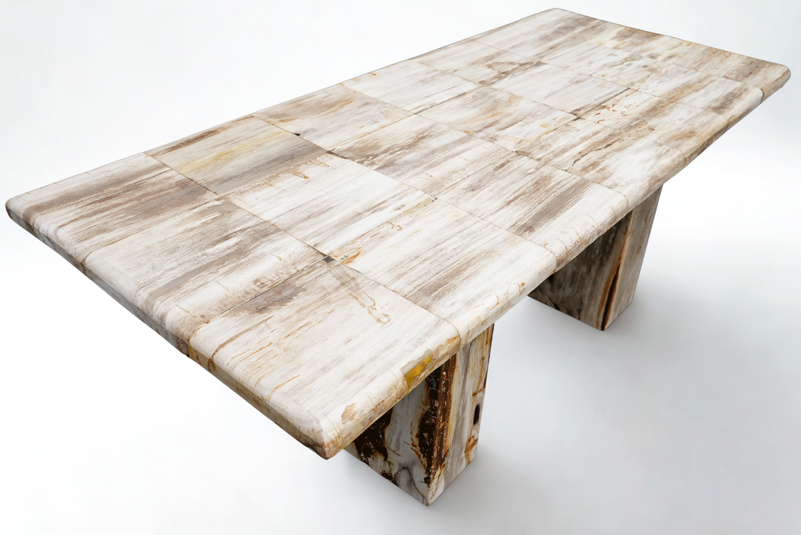 Table rectangulaire en bois pétrifié clair à plateau mosaïque aux tonalités minérales naturelles et lumineuses.