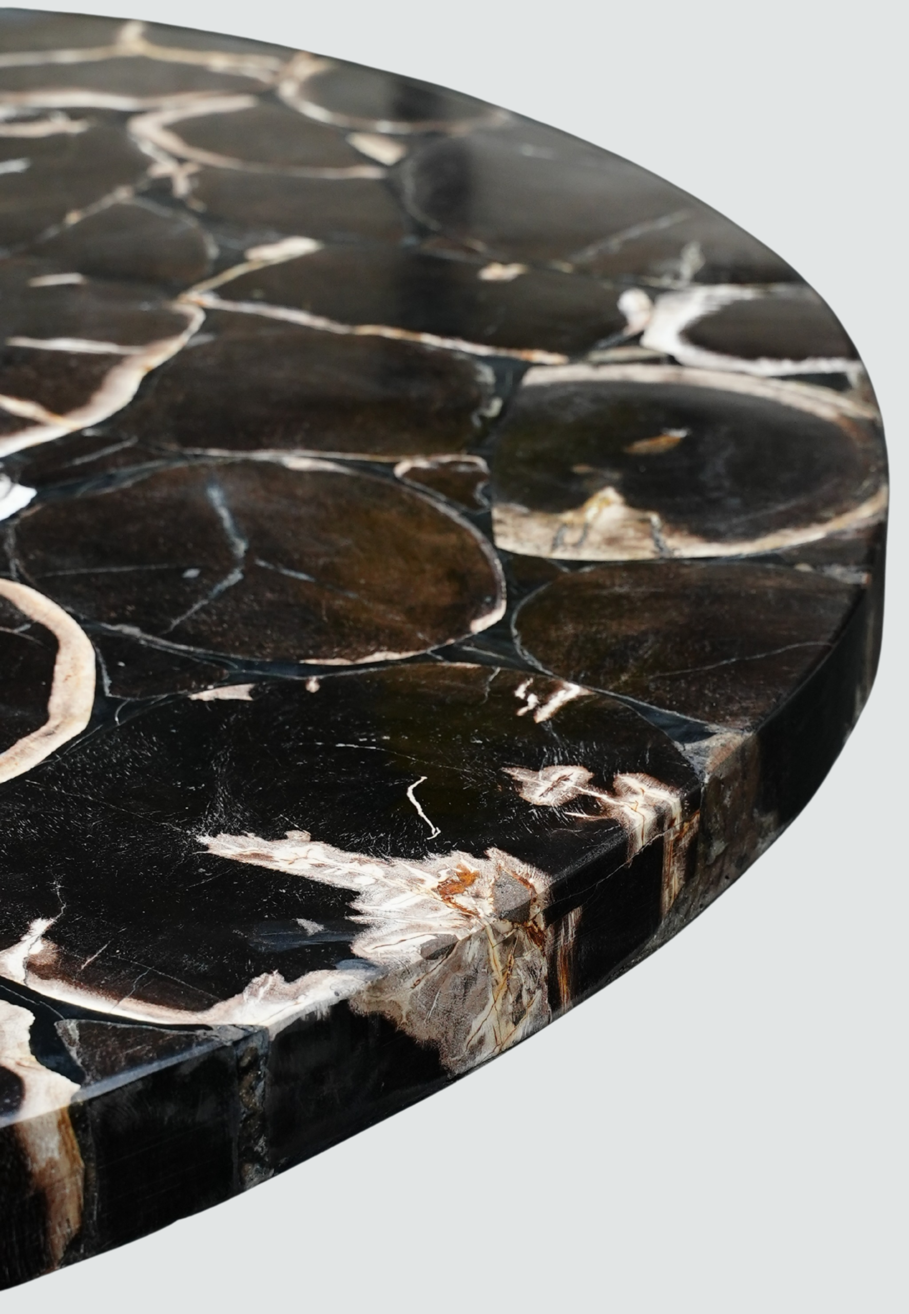 Table ronde en bois pétrifié noir composée de sections minérales naturelles aux motifs organiques spectaculaires.